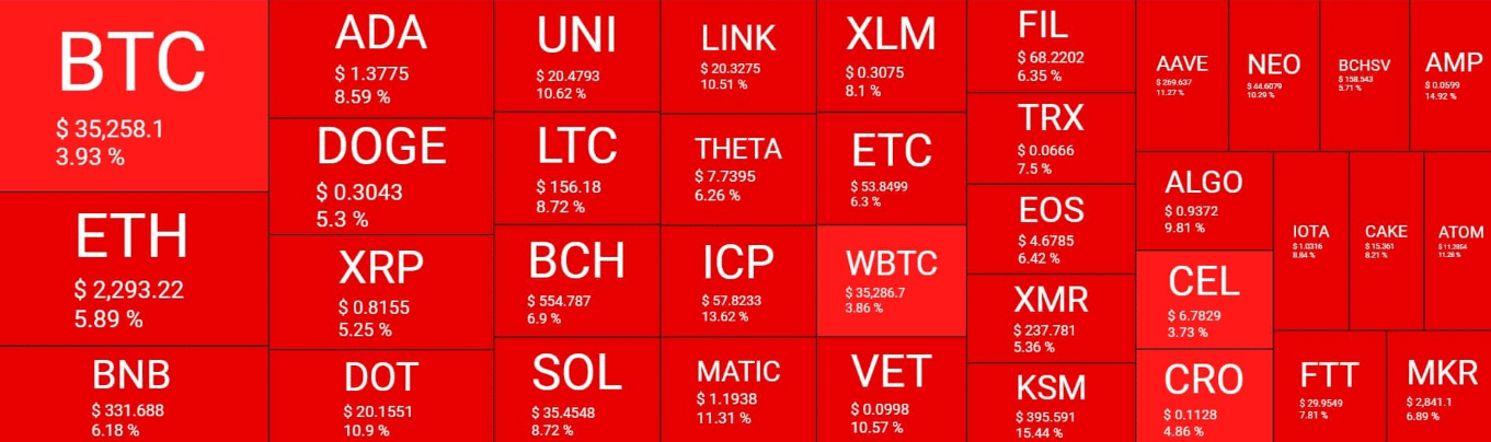 Bitcoin lost over $2,000 within hours and declined below $35,500 for a brief period. However, it recovered a few hundred dollars to now trade above $35,500, but it still represents a 4% drop within the last 24 hours.