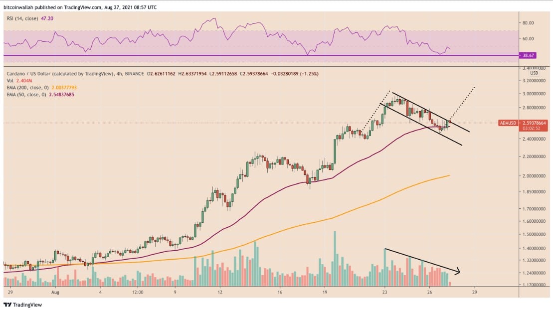Analysts suggest that traders use this EMA as temporary support. If it manages to ride that wave, it will prove that ADA/USD would soon break out. Traders have been using this velvet wave as an entry point since the third week of last month.