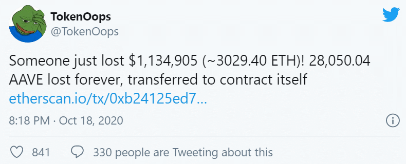 A user from the decentralized finance (DeFi) industry has just lost an amount of $1.1 million in AAVE by mistake. The AAVE user sent a large number of coins to the smart contract address of the token mistakenly where it got locked forever and the user eventually lost it. TokenOops, a service whose task is to ‘track ERC20 tokens transferred to the address of the ERC20 token itself’ found about this erroneous transaction and reported it via a tweet on the 18th of October.