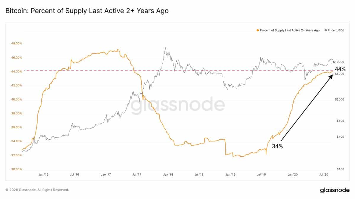 According to a new report by Glassnode, HODLers are not willing to sell their BTC. Instead, they want to store as they believe Bitcoin price may start to show a breakout soon. Most investors have not moved Bitcoin for two years. Bitcoin supply that has not been transferred or moved from two years has jumped from 34% in July 2019 to 44% to the current times.