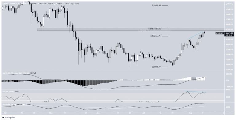 Its upward move started after the price bounced at the $29,000 horizontal support area on July 21. And now, Bitcoin (BTC) is trading under the 0.5 Fib retracement resistance level at $46,950. Technical indicators are revealing some bullish signs, but not enough to ascertain a bullish reversal. While the MACD has given a bullish reversal signal and the RSI has just crossed above 50, the Stochastic oscillator is still bearish.