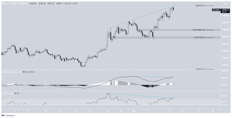 Furthermore, there are more signs of weakness in even shorter time frames such as the six-hour chart. Both the RSI and MACD have created bearish divergences. In addition to this, it seems that BTC is pursuing an ascending resistance line, which has just rejected the price. If a downward move happens, the nearest support levels would be found at $39,900 and $37,750.