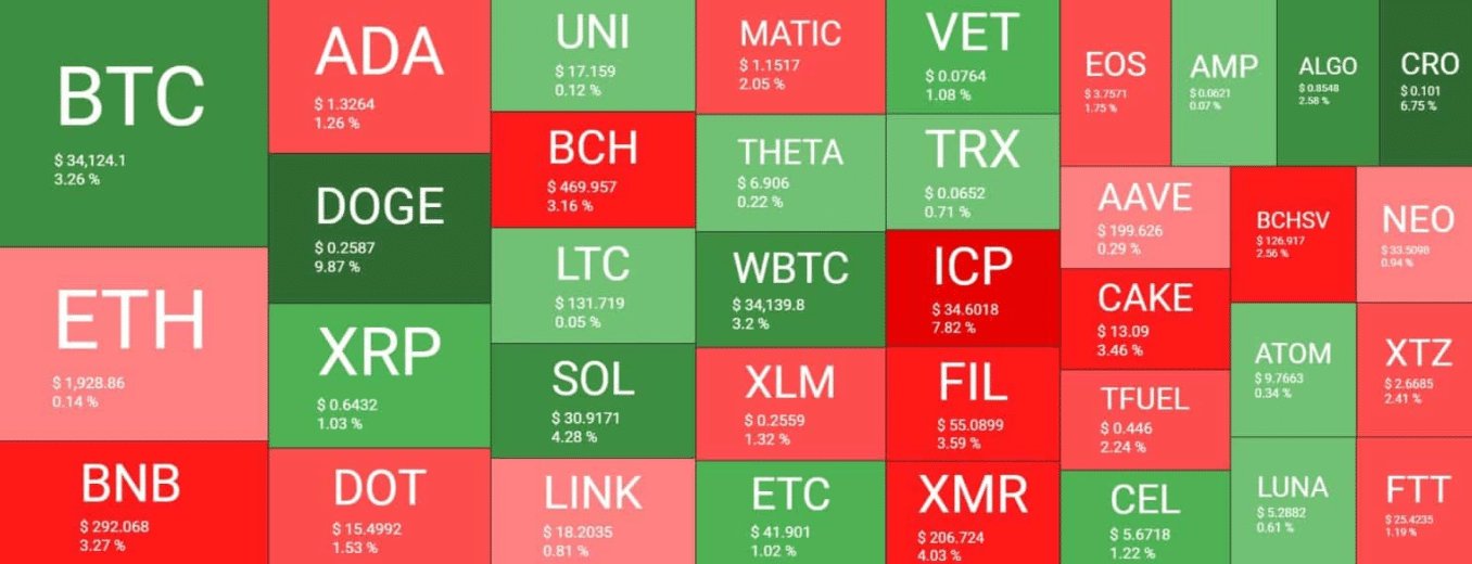 After attaining a 4-day high of about $36,000, bitcoin couldn’t rise further. But its market dominance got extended. Its market dominance extension was because all altcoins, except Dogecoin, have stalled. Dogecoin has risen by double figures.