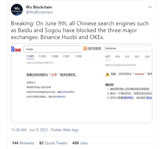 As confirmed by BBTC news portal and Colin Wu, top Chinese blockchain journalist, OKEx, Huobi, and Binance are no longer visible in the search engine results of Sogou and Baidu.
