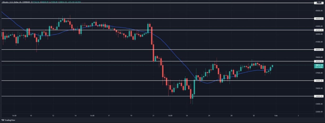 Between January 28 and 31, it retraced back from the $38.5K level and consolidated around the $34-35K range. While the bears were in temporal control of the BTC price on January 30, the bulls re-took control and intensified the buying pressure, which pushed the BTC price towards breaking the $38.5K local resistance.