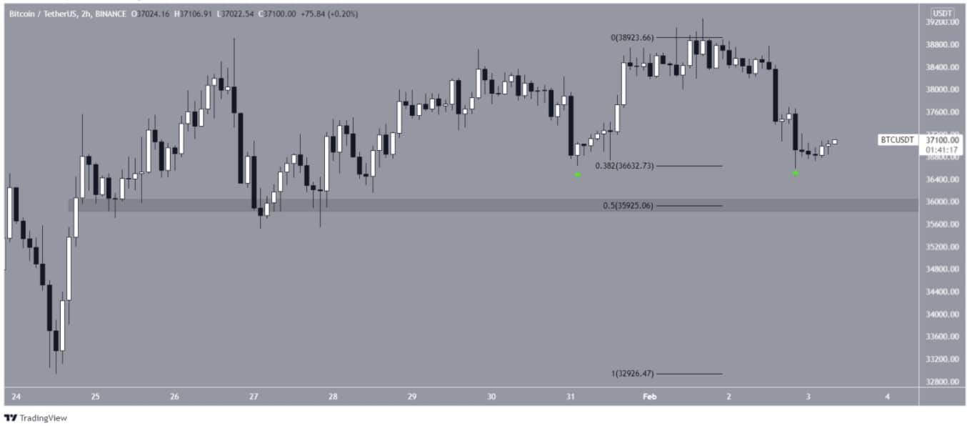 The 2-hour timeframe suggests two theories supporting BTC price movement would be bearish. First, BTC would likely make a bearish move. It had previously closed above the candlestick peaks of January 26 before closing below it during the next trading session.
