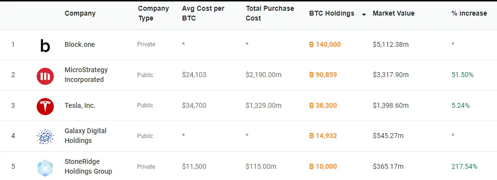 With 140,000 bitcoin holdings, block one leads the pack and is followed by MicroStrategy incorporated and Tesla inc. In that order. MicroStrategy is especially a bitcoin bull, reflecting in the amount of bitcoin it holds (over 90,000). Microstrategy’s bitcoin investment has increased by almost 50% in recent months, with its CEO, Micheal Saylor, singing the praises of bitcoin in a recent chat with Max Keiser.