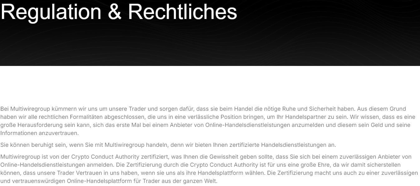 Der Grund für meine Multi Wire Group Bewertung ist, dass diese Firma konform ist und ethisch handelt. Sie hat sich seit ihrer Gründung an die AML- und KYC-Richtlinien gehalten. Bis heute stehen die Teams fest zu ihrem konformen Ansatz und fordern von allen ihren Händlern dasselbe. Das hat der Multi Wire Group Handelsfirma geholfen, eine hochprofessionelle Handelsumgebung anzubieten.