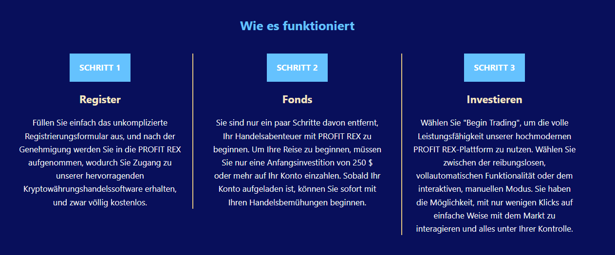 Der PROFIT REX AI Krypto-Handelsroboter ermöglicht Tradern, ihre Handelsaktivitäten bequem von zu Hause aus durchzuführen und gleichzeitig zu arbeiten, während in den Ferien gearbeitet wird. So können Trader von einem optimierten Trading-Erlebnis profitieren. Der Handelsroboter bietet den Tradern eine umfassende Palette an Funktionen und Analysewerkzeugen. Diese helfen ihnen, ihre Krypto-Handelskarriere voranzutreiben.