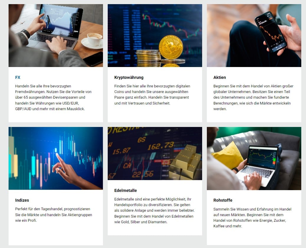 - Marktbreite: Die Plattform unterstützt mehrere Arten von Handelsinstrumenten, darunter Devisen, Kryptowährungen, Aktien, Indizes, Edelmetalle und Rohstoffe. So können Sie den USD/EUR-Wechselkurs verfolgen, während Sie die neuesten Kryptowährungen im Auge behalten, und dann zu Rohstoffen wie Gold oder Öl wechseln – alles in derselben integrierten Umgebung.