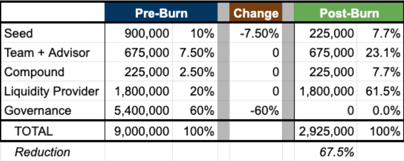 “This burn will include 100% of the “governance” tokens, and 75% of the Seed tokens. We believe that this action will provide greater certainty to the current token holders while creating a stronger foundation for long-term success of the project.”