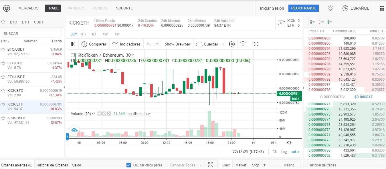 Actualmente, los siguientes pares de negociación están disponibles en el intercambio de KickEX: ETH / BTC; BTC / USDT; ETH / USDT; KICK / BTC; KICK / ETH; KICK / USDT. En un futuro próximo se agregarán las monedas Bitcoin Cash, Litecoin, Ripple y Paxos. Además, pronto estará disponible la venta de criptomonedas para fiduciario, compras y retiros fáciles con tarjetas bancarias.