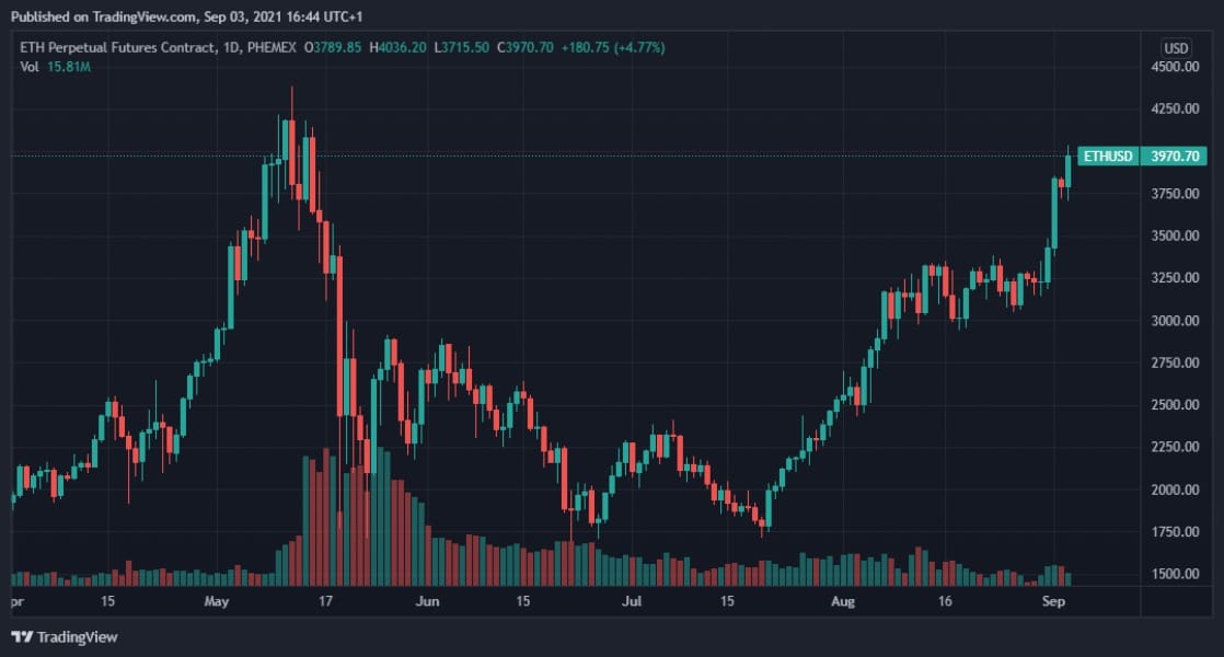 As of May, Ether was outpacing Bitcoin and was on its path to a record milestone. This is the first time since May that Ether has surpassed $4,000. In the previous week, Ether, the world’s second-renowned digital currency by valuation, has risen roughly 20 percent, as opposed to Bitcoin’s 2% increase. After a roughly 60 percent sell-off on May 12, analytical indicators show that ETH is ready to go upward towards its all-time high at USD 4,300.