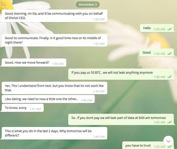 An official member from the insurance company talked to one of the hackers who might be the leader of the group. The official spoke on the behalf of the Chief Executive Officer (CEO) of Shirbit. Tokenhell has been able to get hands on the chatting that occurred between them.