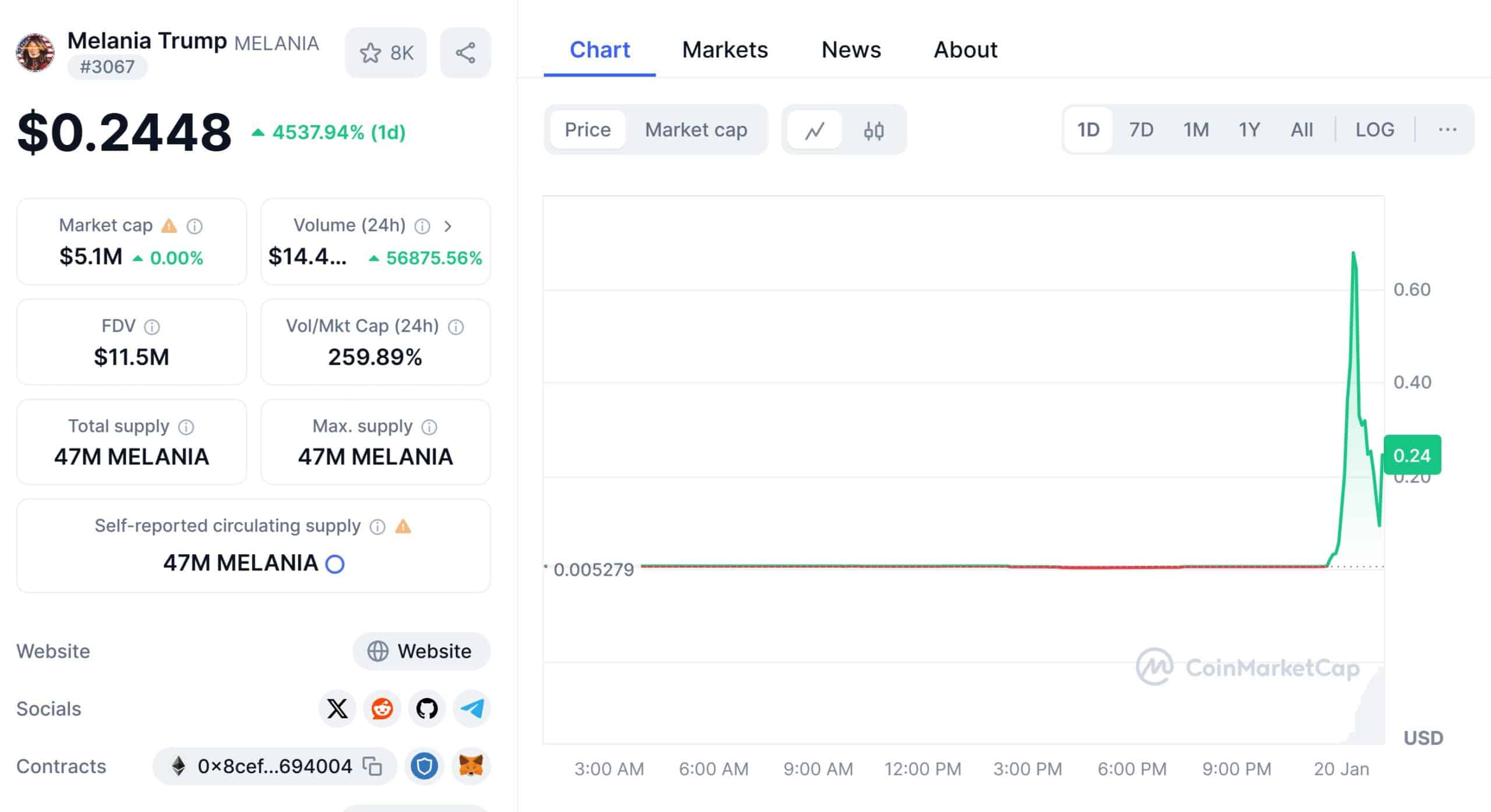 The total and maximum supply of the coin are both capped at 47 million MELANIA, highlighting its limited availability and potential appeal to investors.