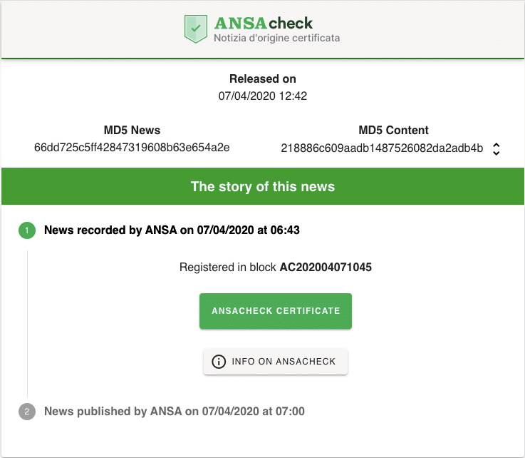 ANSAcheck system is based on EY OpsChain Traceability technology which is ultimately based on the Ethereum blockchain. The platform will use the smart contract technology, an IT object which will let you create a cryptographic string of the news to ‘allow the verification of information’.