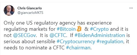 Despite the US Securities and Exchange Commission (SEC)’s request to exercise regulatory rights over the virtual asset class, Christopher Giancarlo has argued otherwise. Giancarlo, a former commissioner for the commodities futures trading commission (CFTC), opined that cryptocurrency oversight falls under the purview of the CFTC and not the SEC.