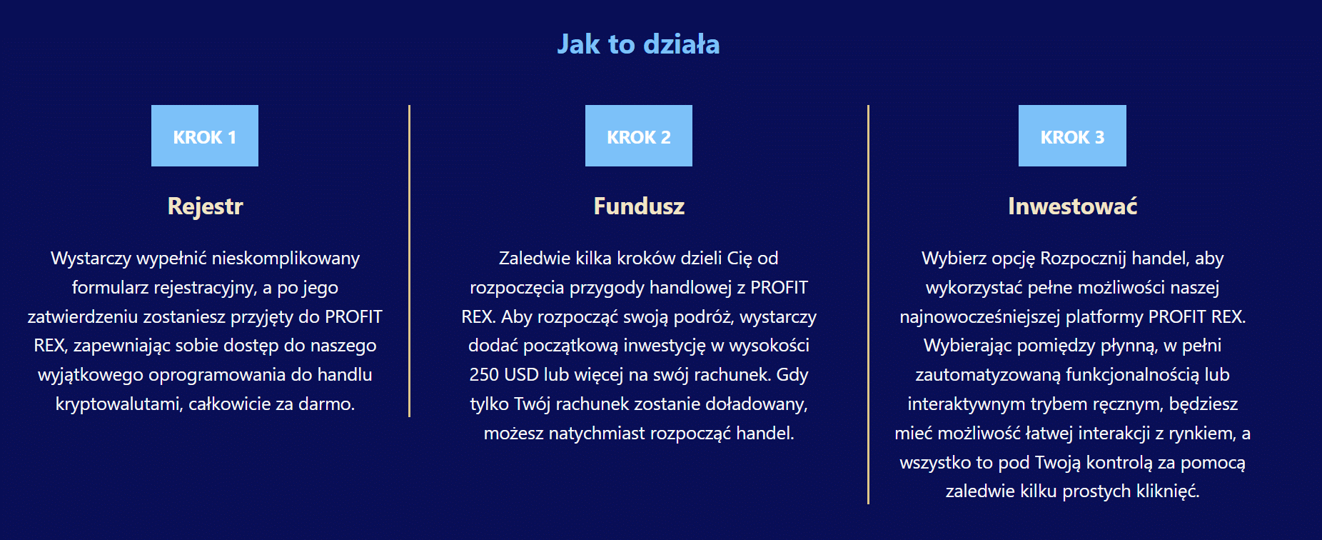 Czy kiedykolwiek czułeś się zmęczony żmudnymi procedurami rejestracji różnych botów do handlu kryptowalutami AI? Jeśli tak, PROFIT REX może okazać się niepowtarzalną opcją, której szukasz. Zarejestrowanie na tej platformie opiera się na usprawnionym procesie wdrażania, dzięki czemu użytkownicy wyjdą korzystnie czasowo. Dzięki temu botowi możesz puścić w niepamięć skomplikowany proces rejestracji, ponieważ faza rejestracji jest uproszczona do granic możliwości. Wystarczy zapewnić podstawowe informacje, aby rozpocząć swoją podróż z tym botem do handlu kryptowalutami AI. Zgodnie z protokołami KYC platforma żąda odpowiednich informacji. Możesz być pewien, że proces ten jest krótki i prosty i wymaga jedynie minimalnej inwestycji czasu.