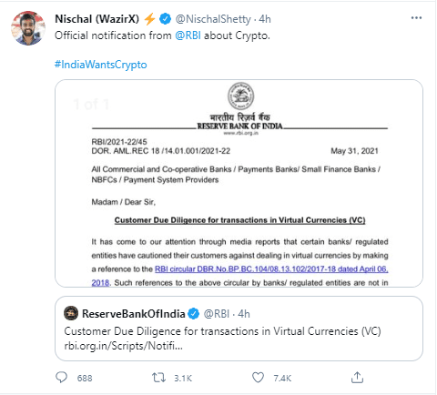 RBI update regarding crypto. Source: Twitter
