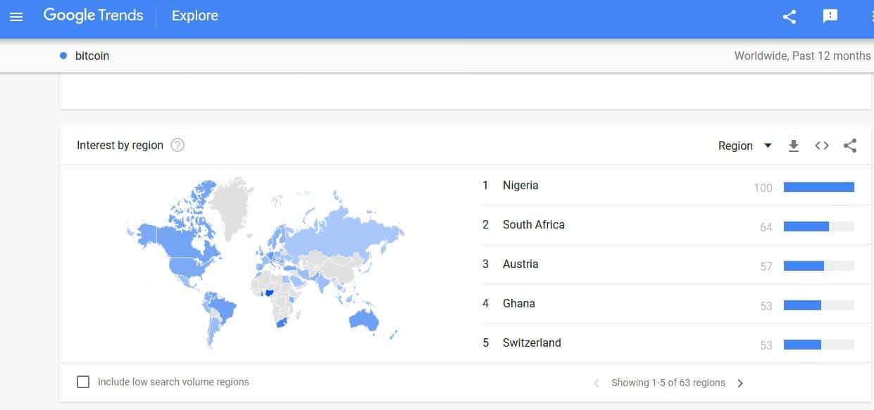 The reason why Nigeria is the most favorable country to invest in cryptocurrency is clear because the data calculated by Google demonstrate that the highest number of searches for Bitcoin is from Nigeria. The other two countries, South Africa and Ghana, are also included in the list of top 5 in the Google trends. The highest interest of people towards bitcoin is not compatible with the real adoption of Bitcoin.